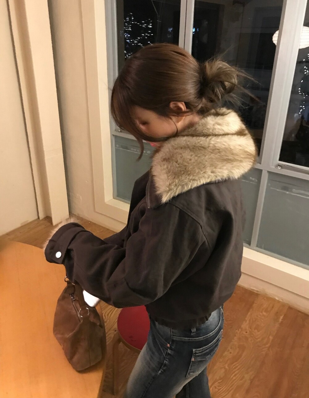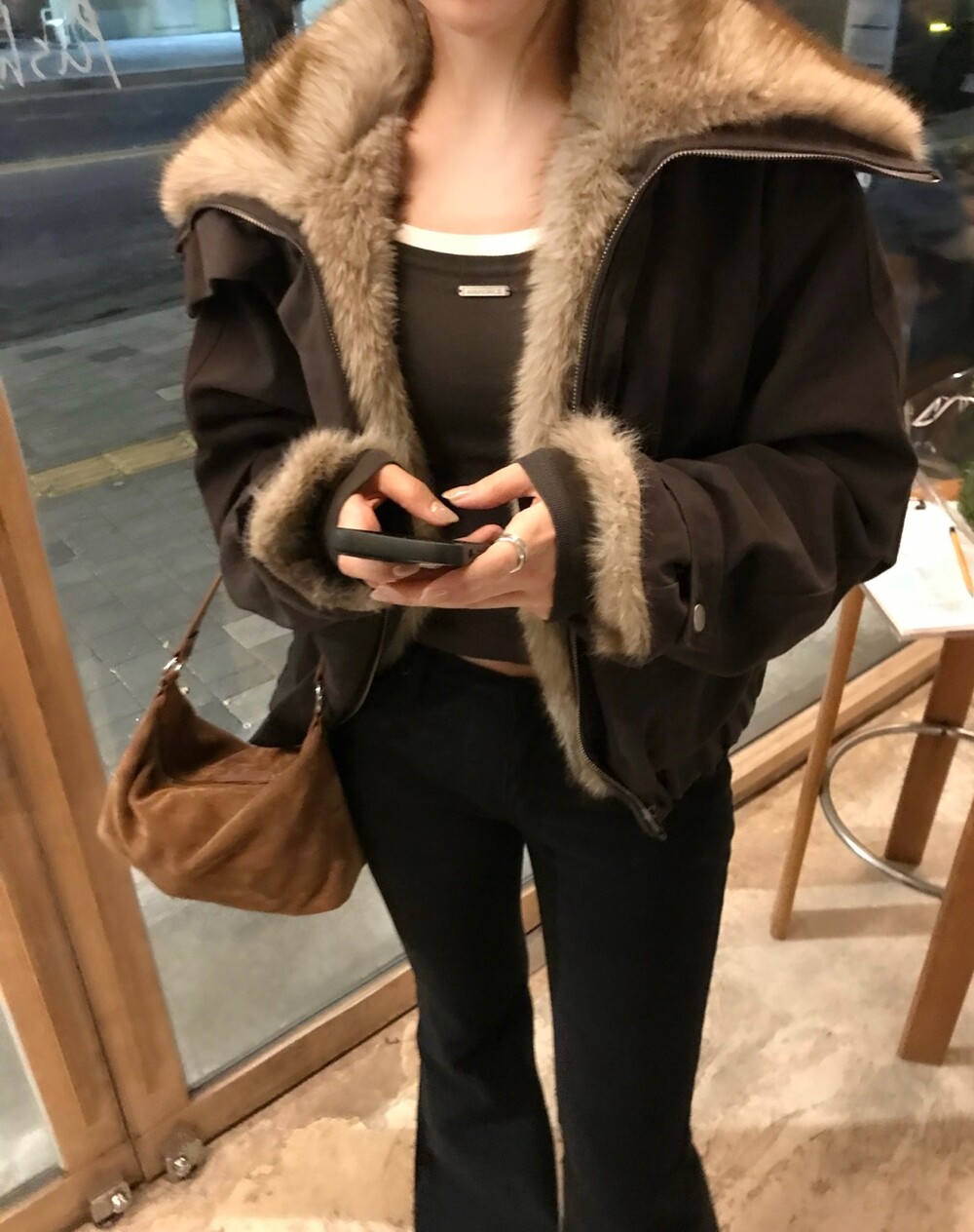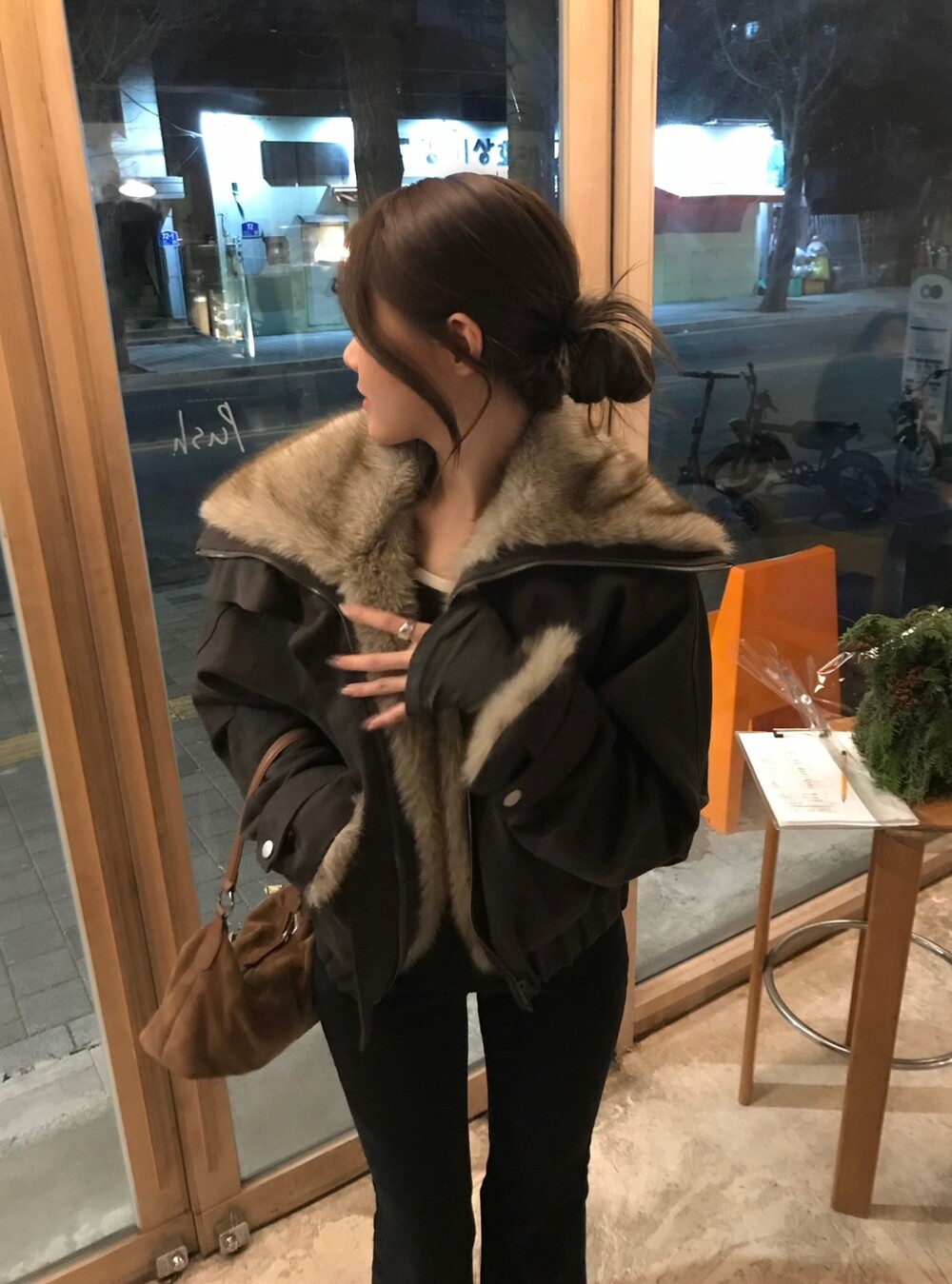 볼륨감 있는 퍼 디테일이 얼굴을 화사하게 살려주며