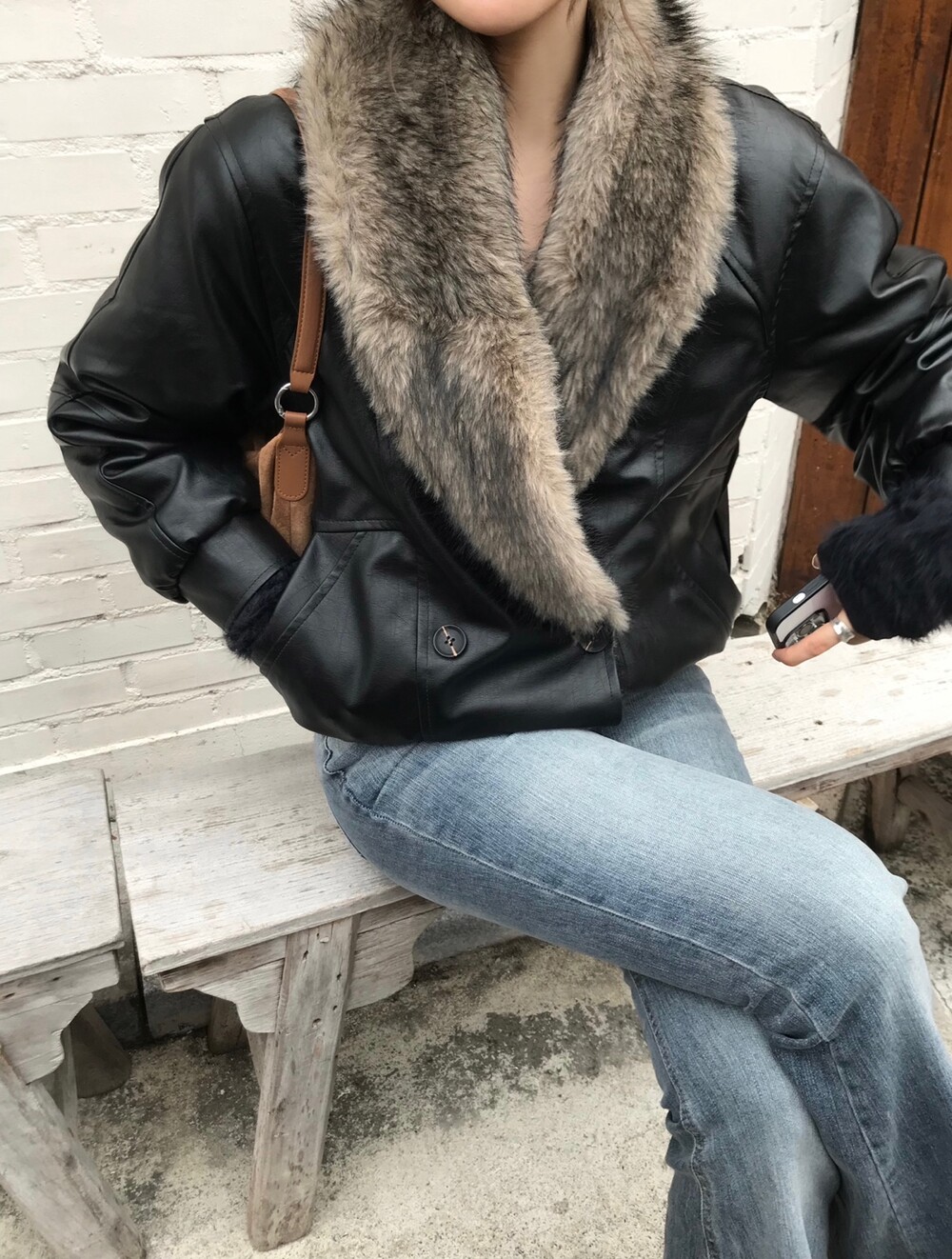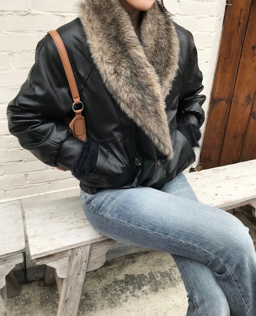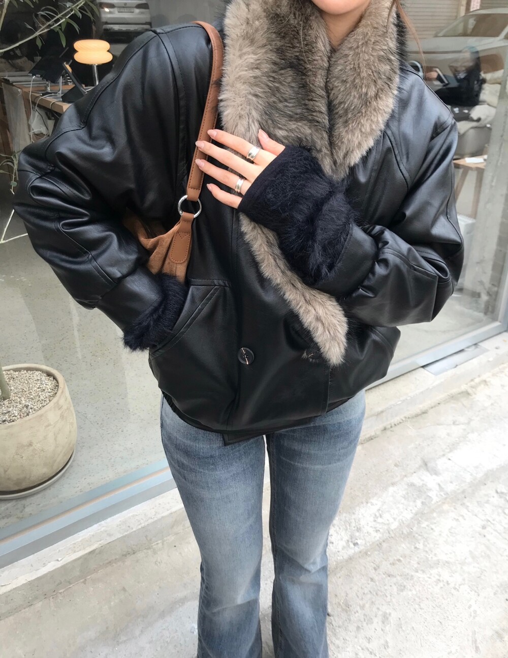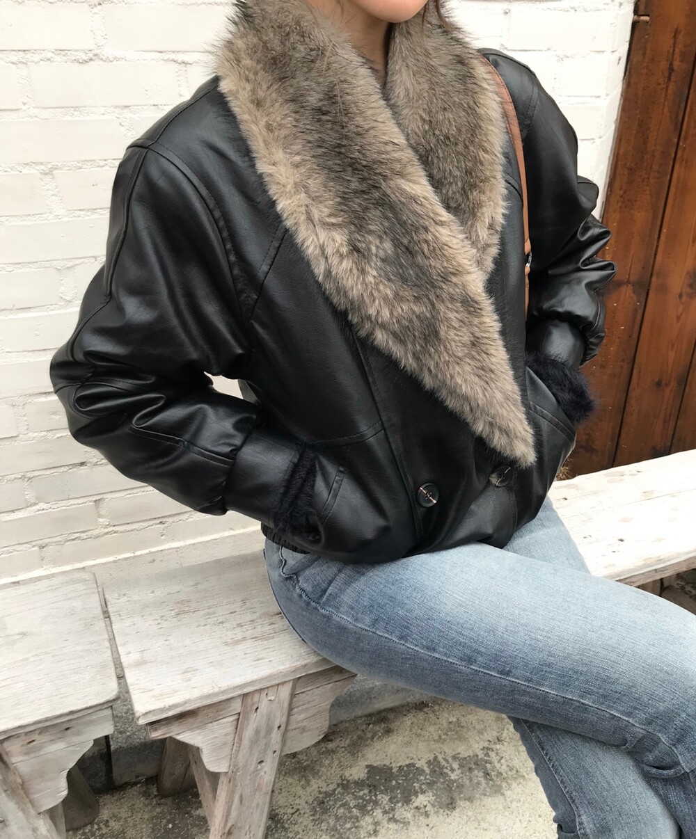 레더 블루종 디자인에 전체 퍼 안감이 더해진 자켓입니다