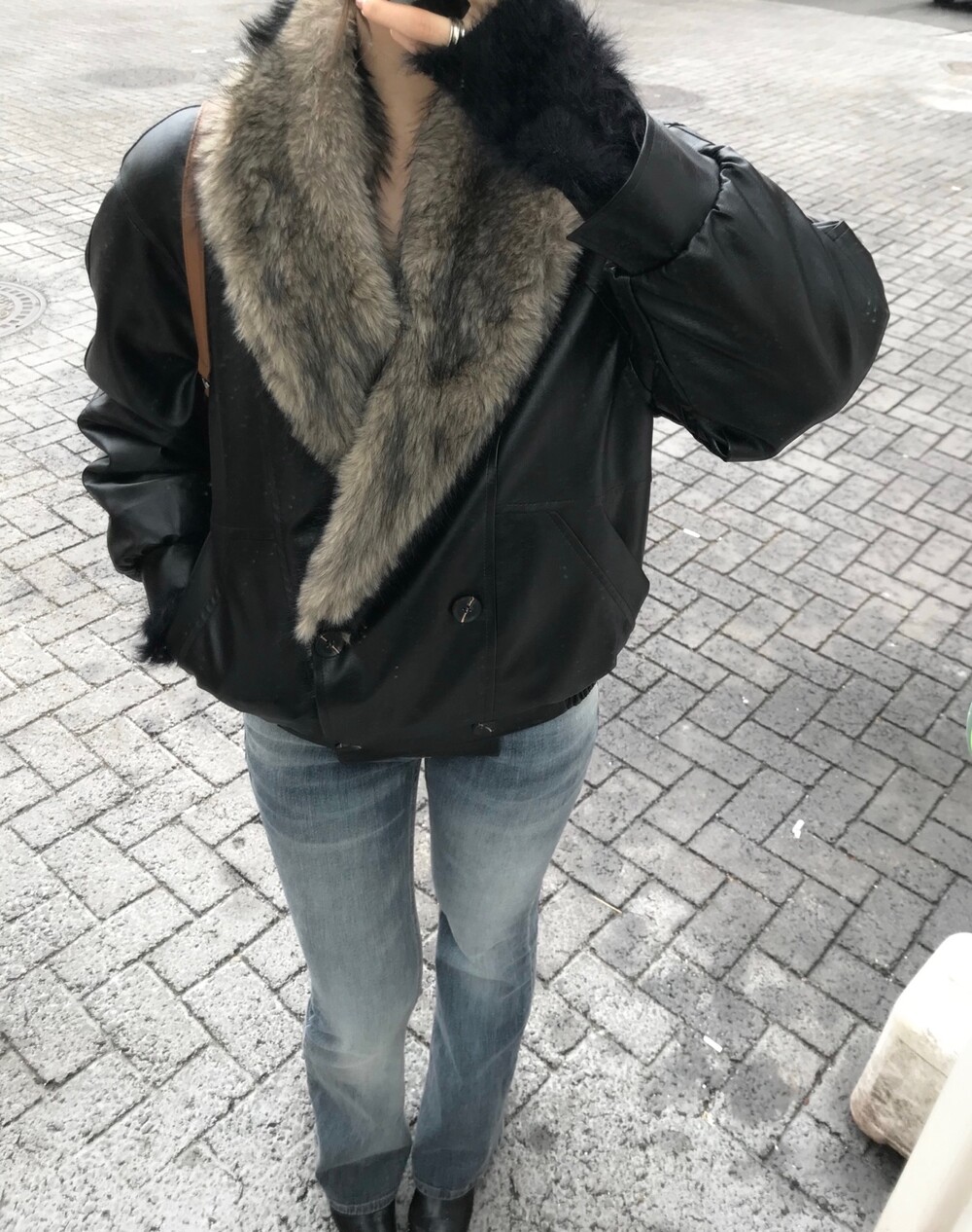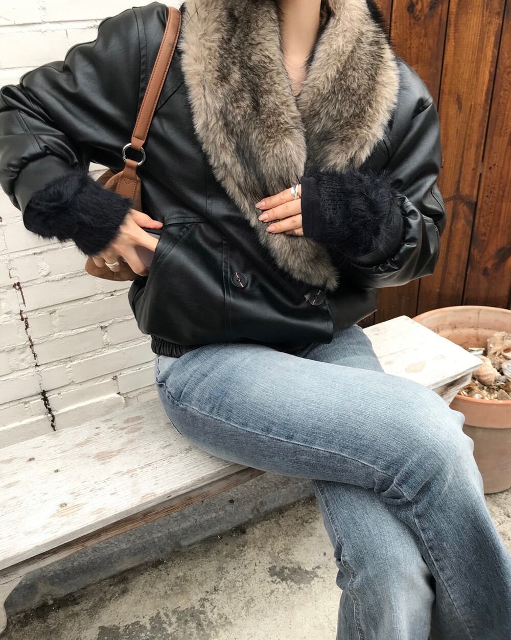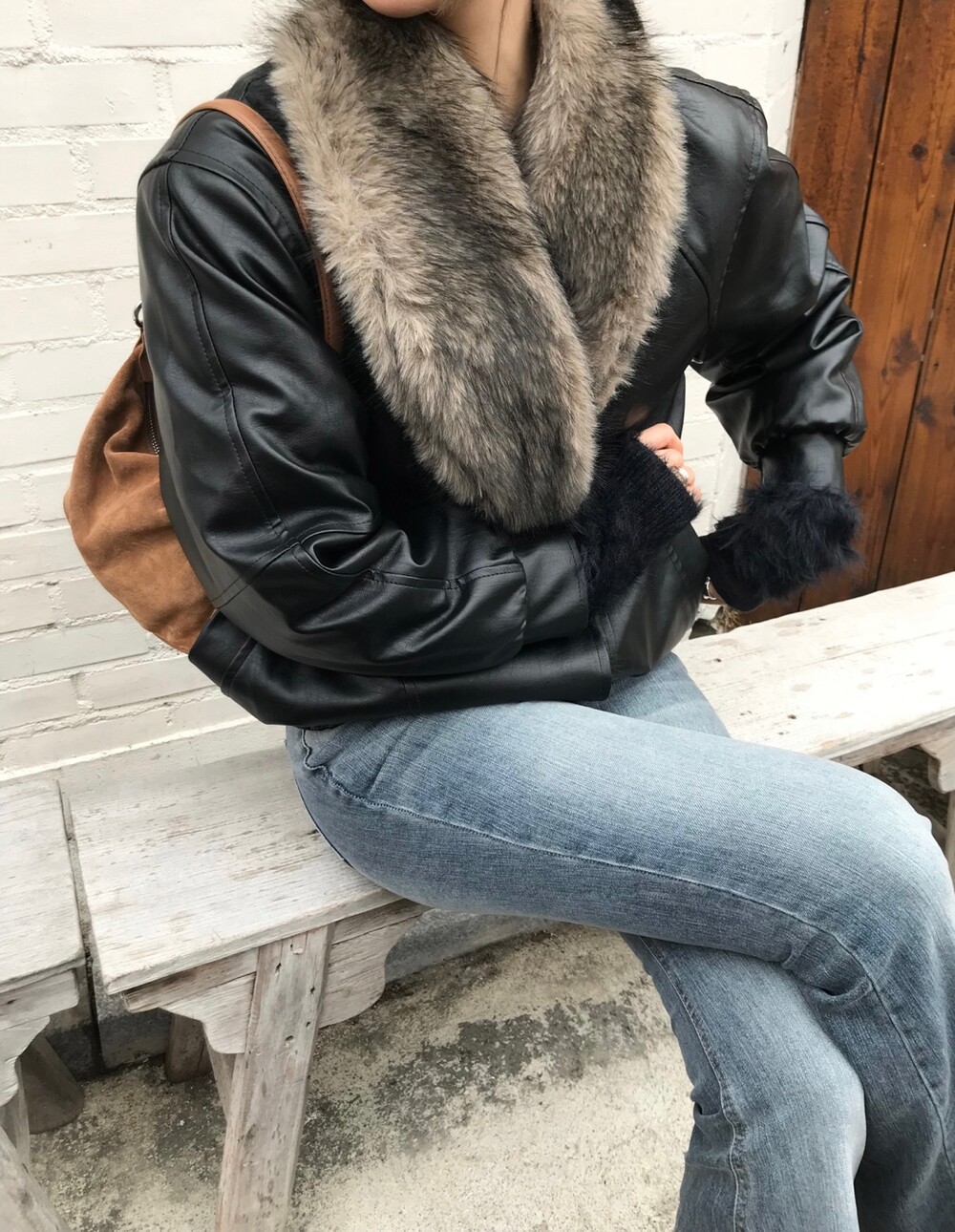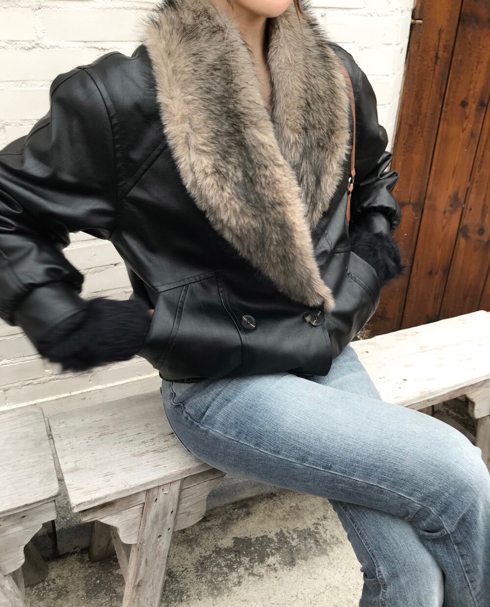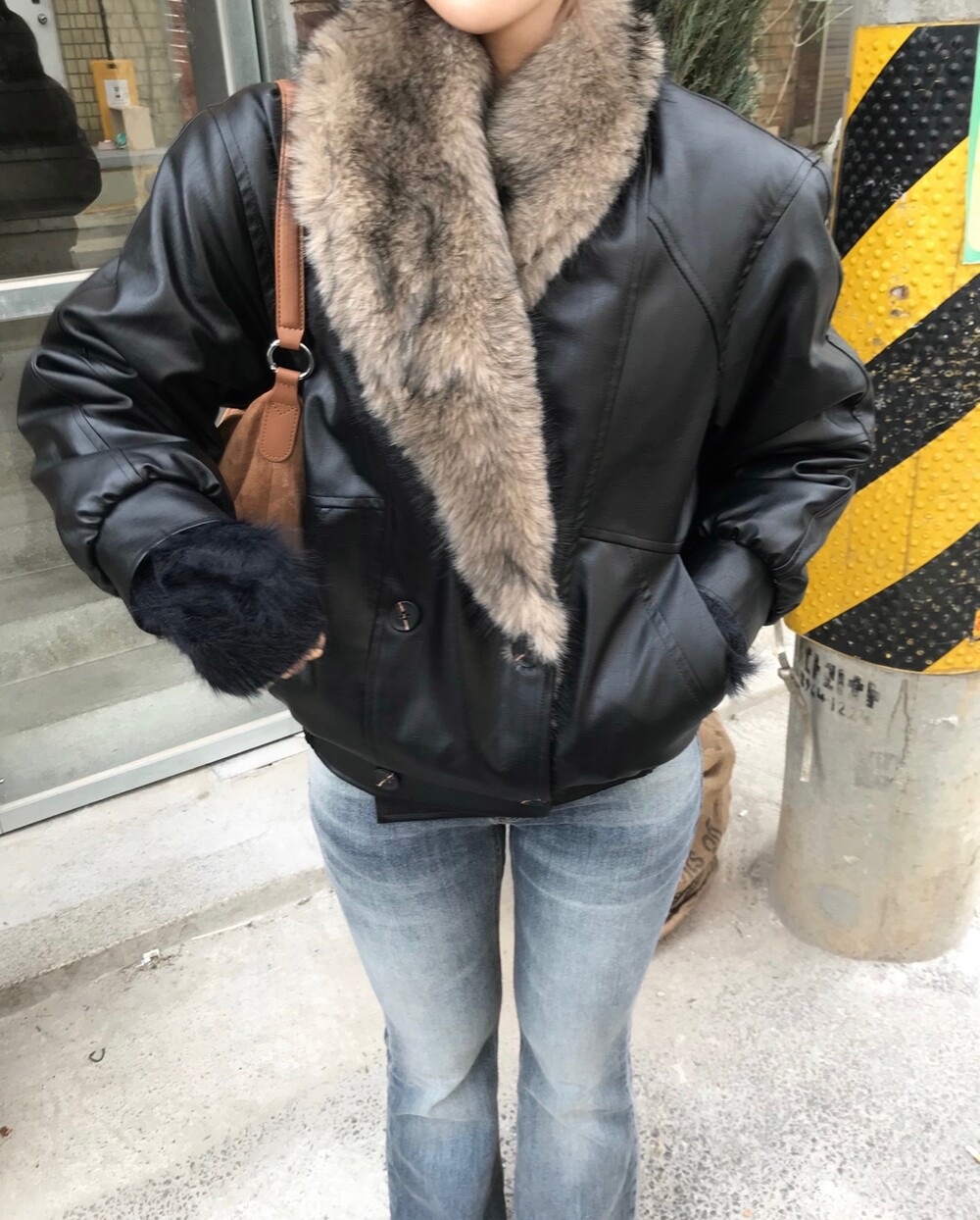 레더 블루종 디자인에 전체 퍼 안감이 더해진 자켓입니다