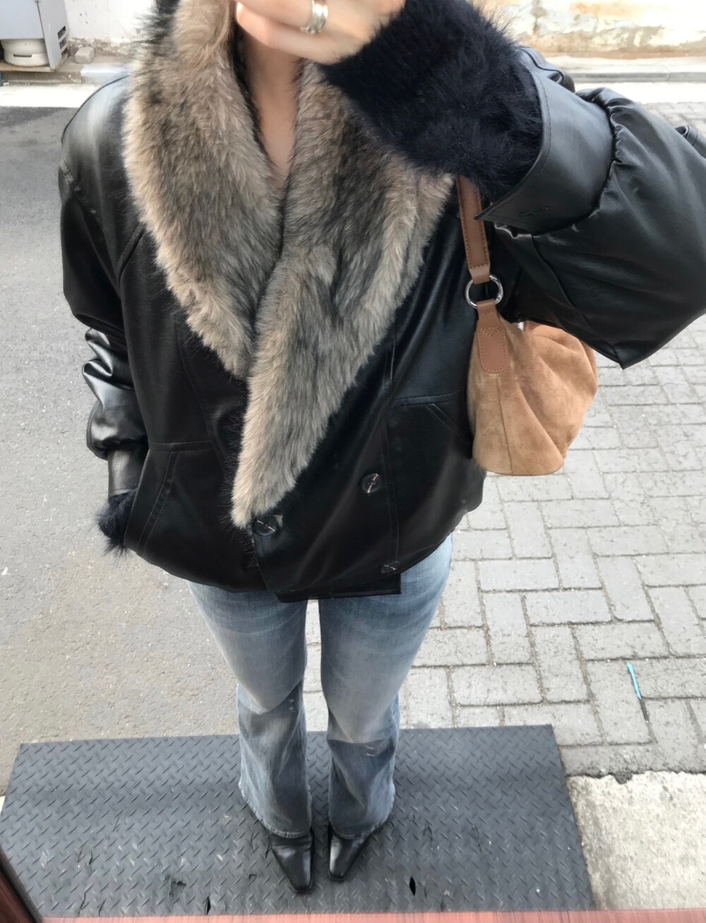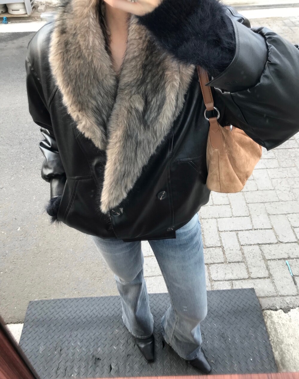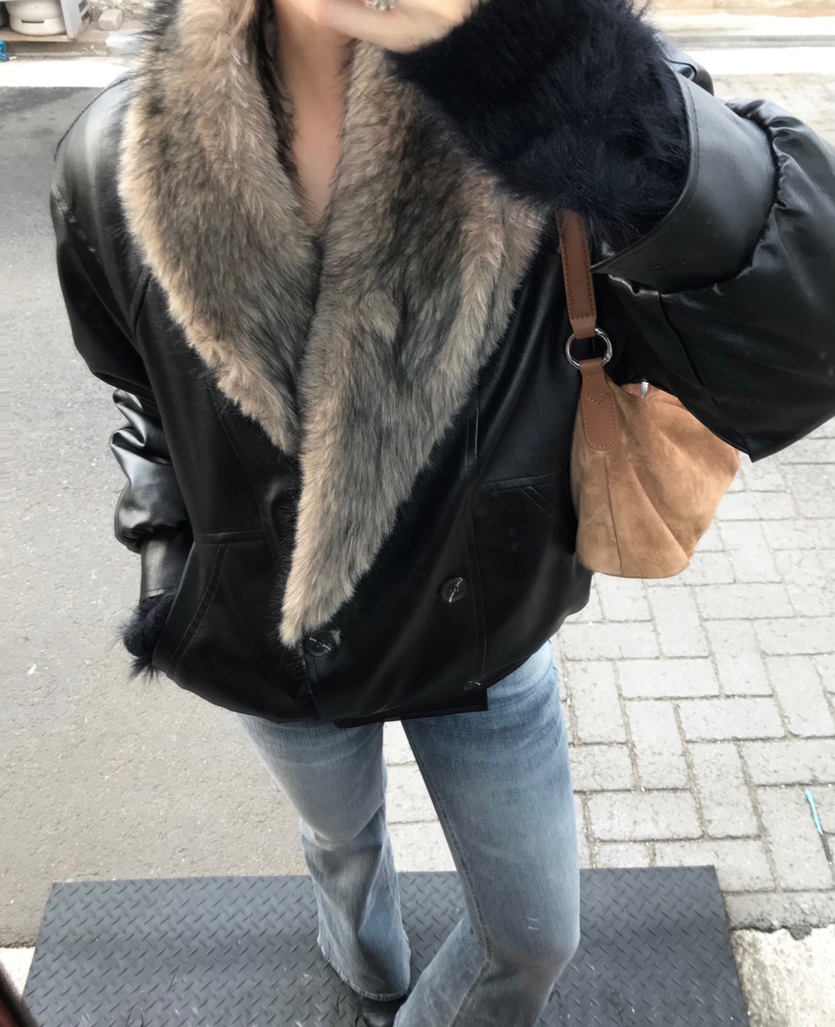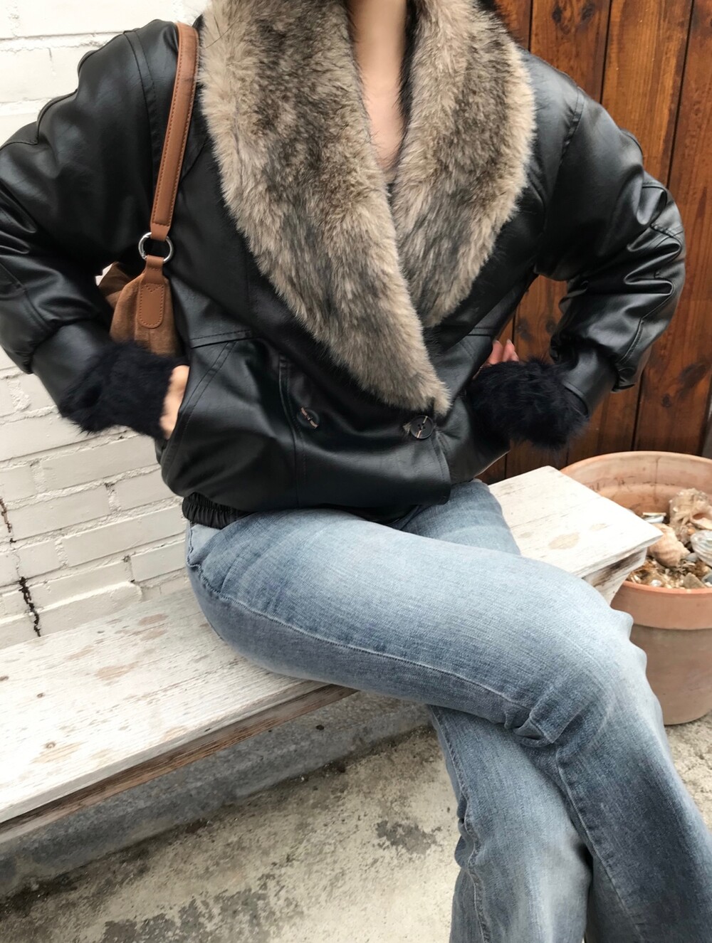 레더 블루종 디자인에 전체 퍼 안감이 더해진 자켓입니다